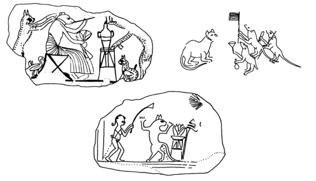 But ancient cats could be cute little morons too. On Egyptian craftsmenโs drawings we see a clear sense of humor, playfulness, and farce, maybe even social satire. Have a look for yourself. (I particularly like the masterpiece โRegretful Shitty Kitty โ the one that seems to be looking back and saying whoops!) Somebody did not take pets all that seriously. And of course not! Cats are funny, universally speaking. And sometimes not so brain-smart. This is known.