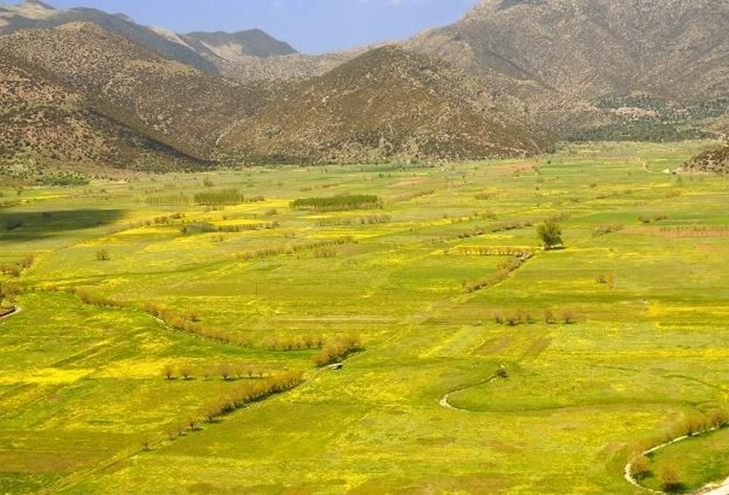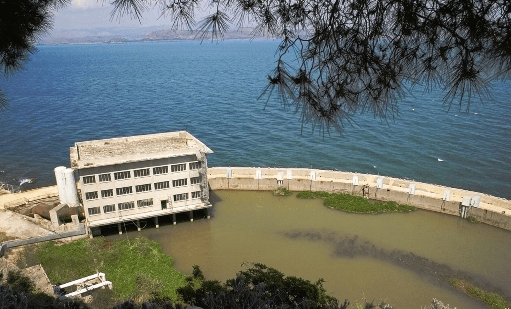 At Dine, 28 kilometres from Nestani, the water emerges from the seabed through three โeyesโ in the rocky bed which are now enclosed by a modern concrete dam. This excludes seawater, meaning that relatively fresh water can be pumped out and used to irrigate farmland.