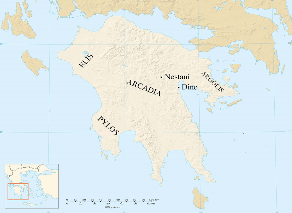 The underground river from Nestani to Dine is central to a legend about the birthplace or genesis of Poseidon, the Olympian god known as โearth shakerโ. In Arcadia he was venerated as a horse god and as a god of the waters who created springs with a strike of his trident. According to one version, when the goddess Rhea gave birth to Poseidon she had to hide him from his father Cronos who whenever she bore a son would eat the baby lest it become a threat to him. Rhea told Cronos that this time she had given birth to a foal; she hid the infant Poseidon in a sheepfold next to the sinkhole at Nestani in the care of the water nymph Arne. From there Poseidon was taken underground and reappeared at Genesion (Dine), where he was born for the second time. Poseidon is the father of the winged horse Pegasus whose name is derived from ฯฮทฮณฮฎ (pฤgฤ), โspringโ. The legend must account for the sacrifice of horses reported by Pausanias.