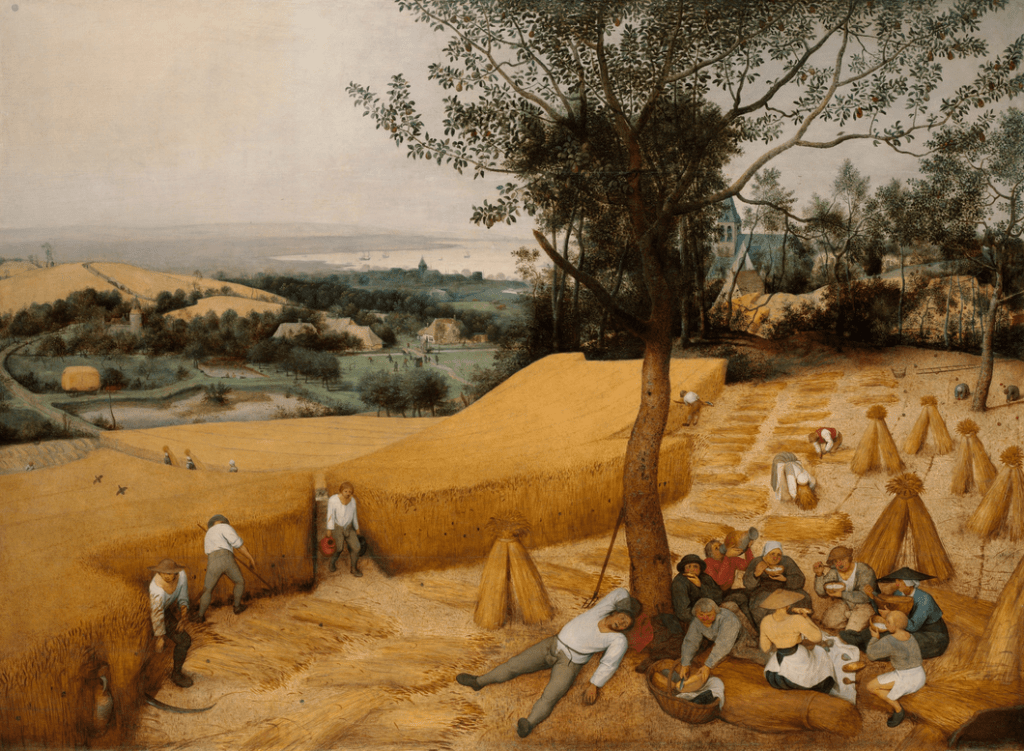 The scene is at first bucolic: there is song, there is an excess of food, everyone has their role and is busy and fruitful in their work. All is well-ordered, crops are cut in straight lines, workers are filled with happiness to perform these tasks. But at the heart of the image is the Hesiodic figure, able to stand by in idle silence as this whole community of subordinates โ young, old, specialized in different tasks โ works busily to his profit.