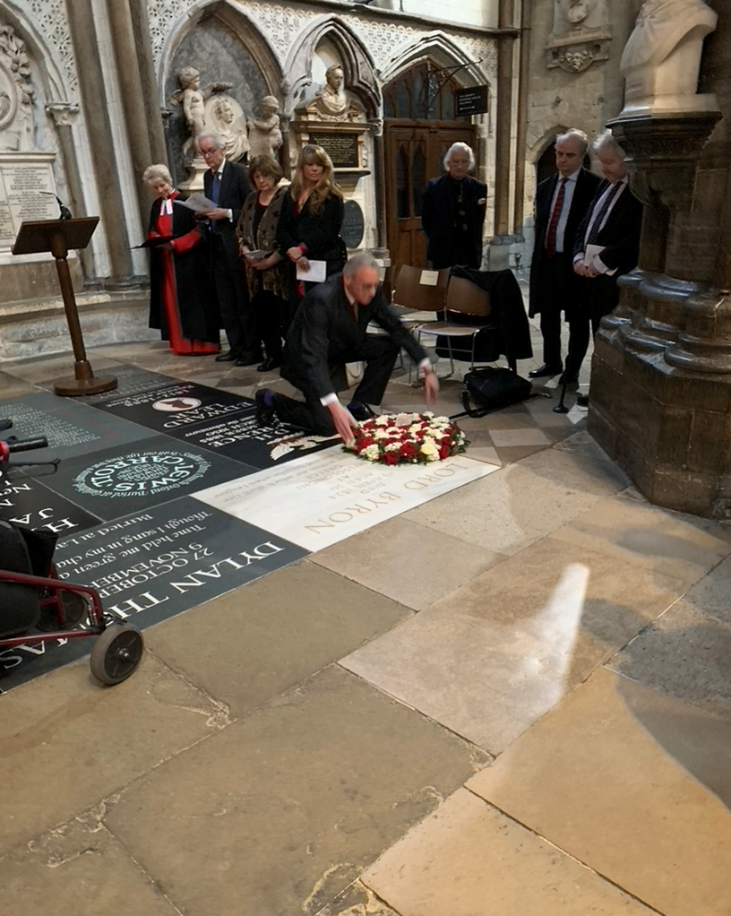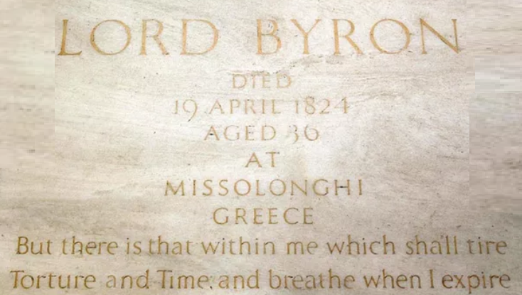 Last month saw two very different ceremonies to mark the 200th Anniversary of the death of Lord Byron. In London, a wreath was laid by Lord Lytton with a group of members of the Byron Society on the simple grey slab which commemorates Byron in ‘Poets’ Corner’ in Westminster Abbey. In Athens, on National Byron Day he was remembered as a hero with the Minister of Defence, Nikos Dendias, giving an address to members of the Hellenic Armed Forces at the Hellenic Army Academy. In Athens, there were nineteen-cannon salutes to mark 19 April, the date of Byron’s death. One celebration subdued, the other martial.