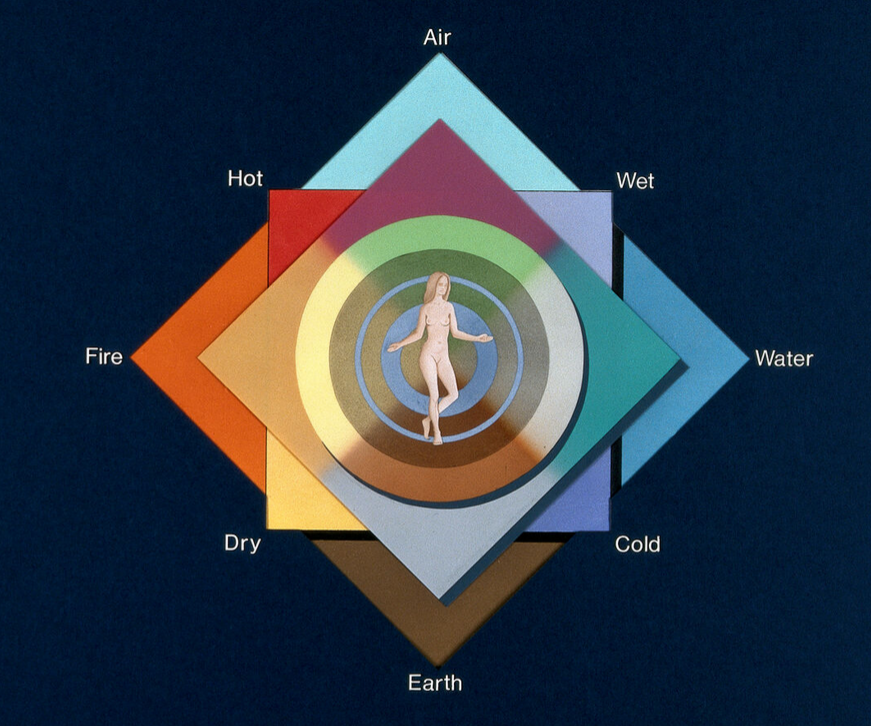 The body of man has in itself blood, phlegm, yellow bile and black bile; these make up the nature of his body, and through these he feels pain or enjoys health. Now he enjoys the most perfect health when these elements are duly proportioned to one another in respect of compounding, power and bulk, and when they are perfectly mingled. Pain is felt when one of these elements is in defect or excess, or is isolated in the body without being compounded with all the others. For when an element is isolated and stands by itself, not only must the place which it left become diseased, but the place where it stands in a flood must, because of the excess, cause pain and distress. In fact when more of an element flows out of the body than is necessary to get rid of superfluity, the emptying causes pain. If, on the other hand, the emptying takes place into an inward part, as well as the shifting and the separation from other elements, the man certainly must, according to what has been said, suffer from a double pain, one in the place left, and another in the place flooded.[9]