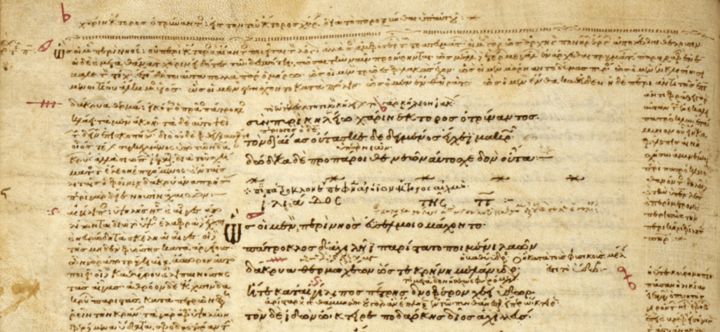We thus note in the line-numbered passage above, from lines 2โ5: ฮธฮญฮตฮนฮฝ (thรฉein, โto runโ); ฮธฮตฮฏฮฟฮนฮฟ (theioio, โof the divineโ [Odysseus]); ฮธฮญฯฮฝ (thรฉลn, โruningโ); and ฮธฮตแฟถฮฝ (theรดn, โof the godsโ). The punning is announced by what are two (formulaically joined) thฤta words, line 1: ฮธฯ ฮผฯฮฝ (thลซmon, โheart, spiritโ) and ฯฯฮฎฮธฮตฯฯฮนฮฝ (stฤthessin, โbreastโ). Line 4, with ฮธฮญฮผฮนฯ (themis, โlaw, adjudicationโ) expands the semantic range, given the shared verbal root and intimate connection between law and divinity, i.e., themis and theos. The play closes in line 6 with neutral แผฮฝฮธฮฑ (entha, โthereโ).