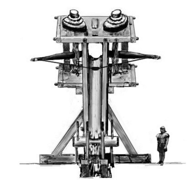 I have always found it difficult to imagine how the Romans could have made practical use of such a large and complicated machine in the brutal business of siege warfare. Apart from anything else, it would often have been vulnerable to continual return fire from the defendersโ own catapult artillery. The answer may lie in a modern reconstruction at Hjemsted in Denmark, which amounts to a heavy catapult stripped down to its minimum essential components.