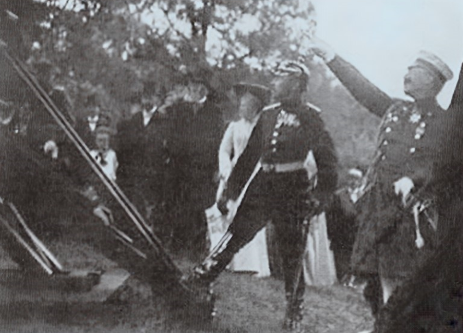 On 16 June 1906, Kaiser Wilhelm II attended one of von Schrammโs firing demonstrations, as shown in the photograph below where he stands next to a one-talent (26kg) stone-thrower. This event nearly changed history. Before one shot the stone-thrower was loaded incorrectly, with the bowstring positioned too low behind the projectile โ an occupational hazard with stone-throwers. On firing, the bowstring was pulled under the rock, flipping it high in the air; on landing it narrowly missed the Kaiser. One is reminded of the similar accident recounted above by Ammianus Marcellinus.