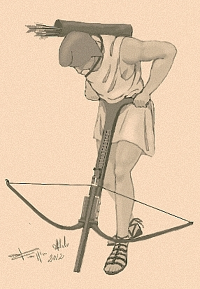 In Caesarโs original Latin, the โcross-bowโ is a scorpio arrow-firer.