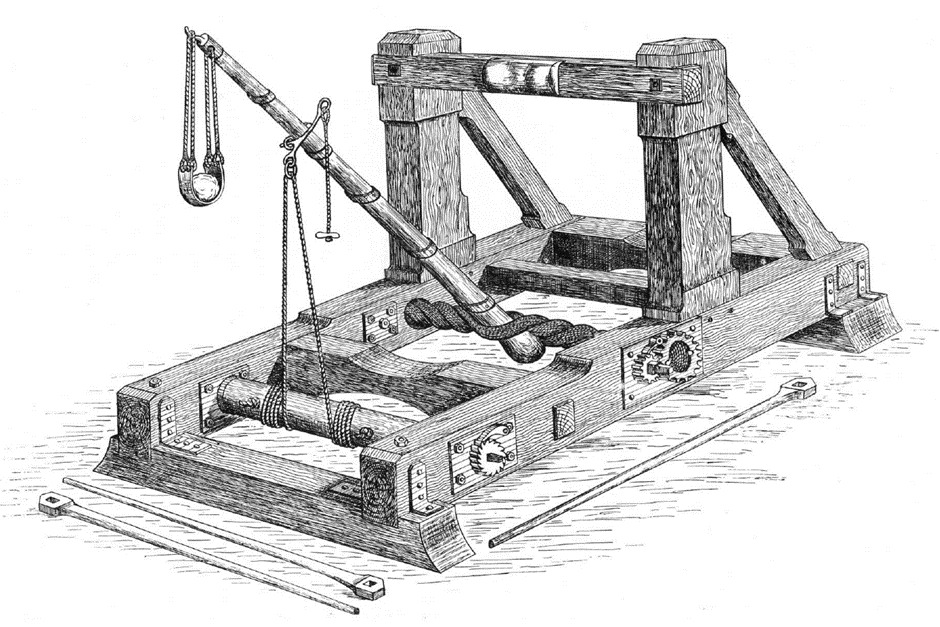 To conclude, it may be helpful to point out the key difference between the catapult artillery of the classical period and the later medieval models. Greek and Roman catapult artillery relied on energy stored in torsion springs. By contrast, many of the later medieval equivalents, such as the trebuchet or mangonel, were constructed like see-saws, with a heavy counterweight at one end causing the other end to swing upwards and fling a solid projectile. The counterweight might consist of a heavy rock, or its place might be supplied by a group of men pulling down simultaneously on ropes. This approach did not allow for the precise aiming of the ancient arrow-firers, but the medieval machines had the virtue of being quick and easy to construct.