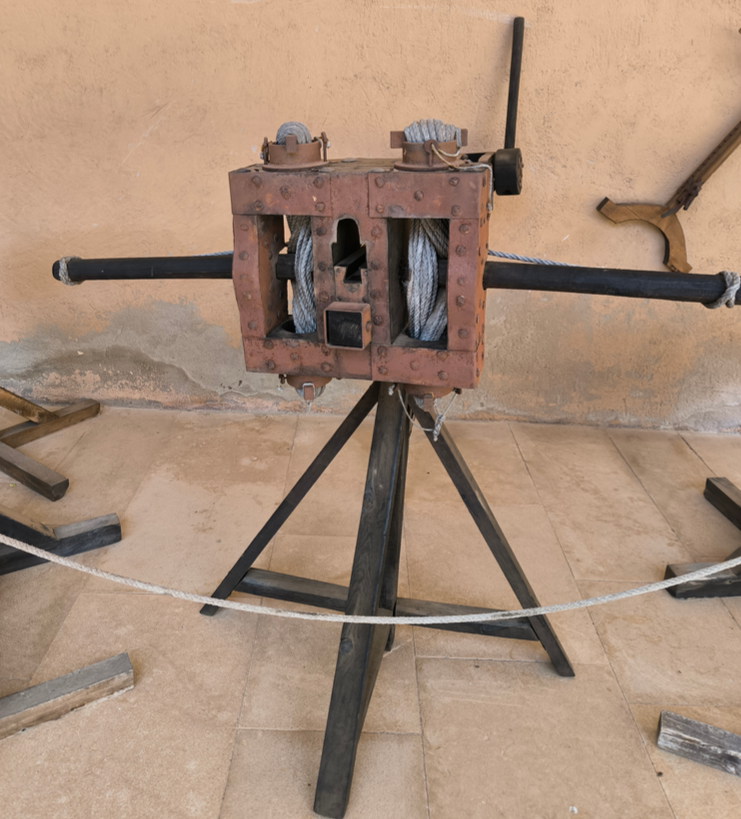 The wooden frame might be fitted with a plate of armour on its front face. The catapult mechanism was mounted on a wooden stand by means of a universal joint which enabled the operator to aim the weapon. Arrow-firers had a two man crew in battle, just like modern infantry support weapons. We can presume that the senior of these was the gunner who aimed and fired the weapon, while his loader would have winched back the mechanism between shots and loaded the arrows. This catapult would have been just about portable over moderate distances, weighing some 60kg, with one man carrying the catapult mechanism itself and the other the support stand.