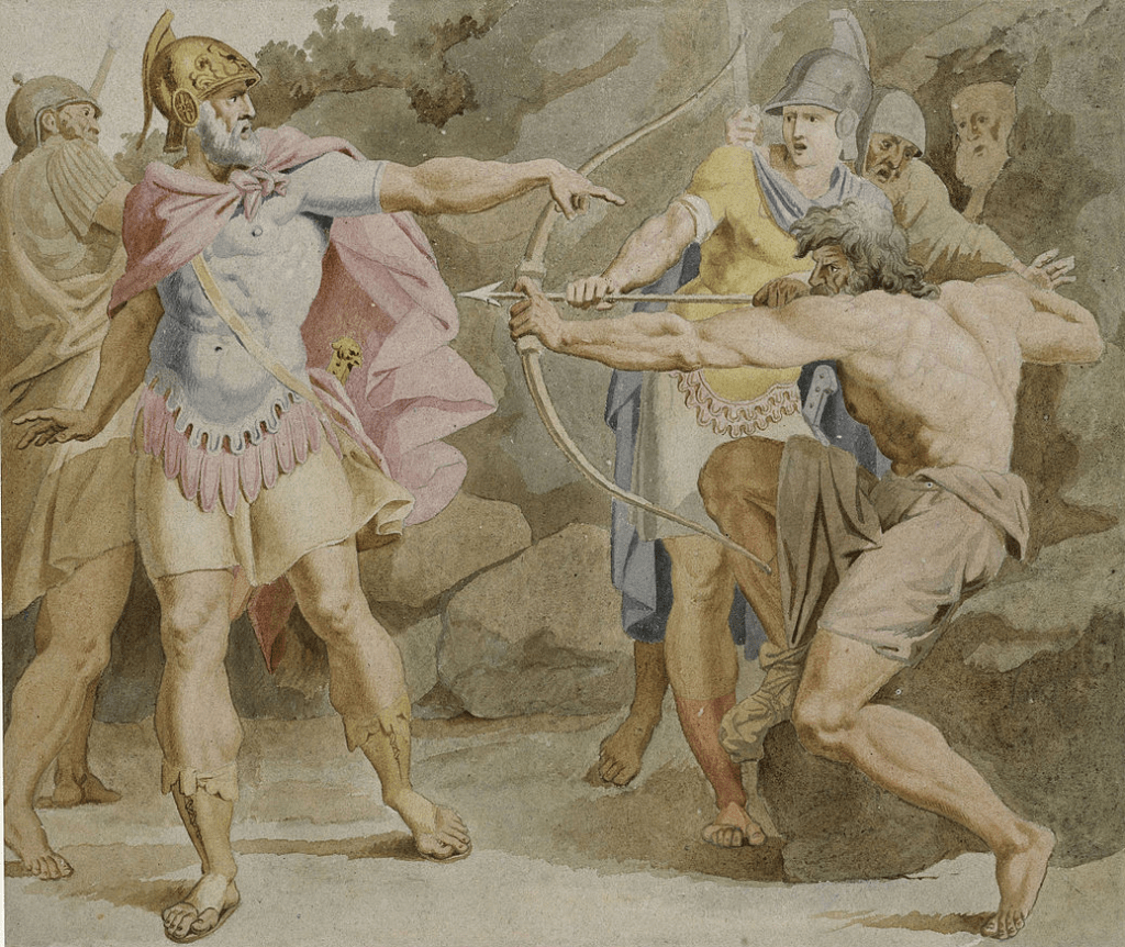 Philoctetes received the bow and arrows of Heracles, unerring weaponry that once belonged to Apollo, as reward for kindling the hero’s funeral pyre.[5] He was chosen as a Greek commander at the start of the Trojan War.