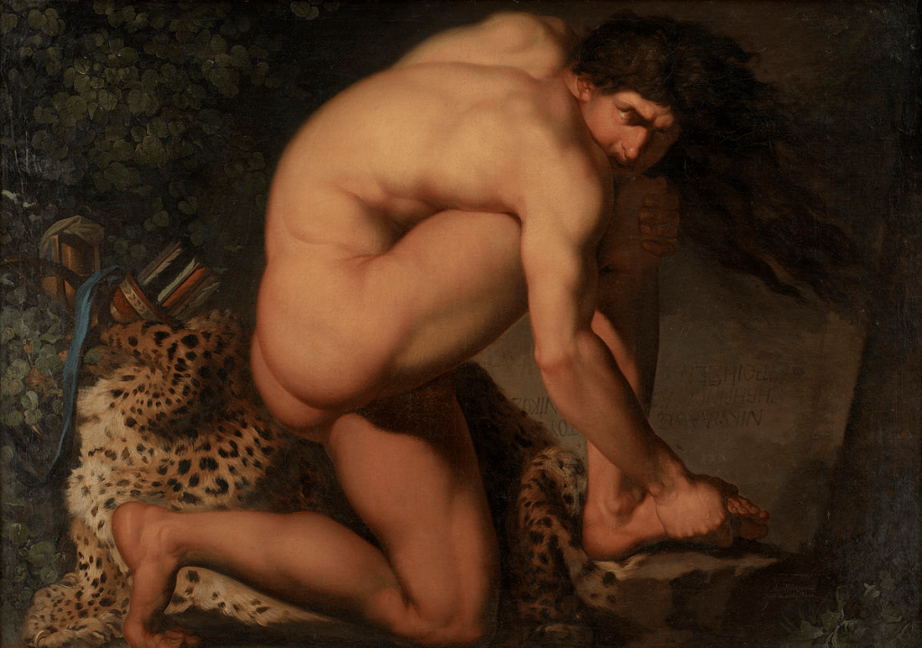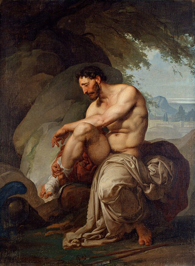 While sailing to Troy, he was bitten by a snake for trespassing on the shrine of the nymph Chryse. The agonizing wound never healed. The wound’s stench and Philoctetes’ cries of pain proved so disturbing that, on the advice of Odysseus, the Greeks abandoned him on the island of Lemnos. For ten years he led a destitute life, wracked by pain, surviving only by hunting with his bow.