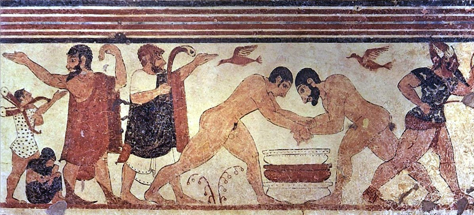 Writers, ancient and modern, have put forward various theories for the origins of Rome’s gladiatorial combats. Some think that they inherited the practice from Campania where Etruscan and Greek practices of duels at funerals merged with the ‘Phersu Game’ – a ritual, depicted in ancient tomb paintings, involving a dog ripping apart a blindfolded man until he died.[1] Other options for its origins are Etruria, Samnis and even Gaul. It is hard to decide exactly where the phenomenon of gladiatorial combat originated and, in any case, is not necessary for understanding it as it manifested in a Roman context.