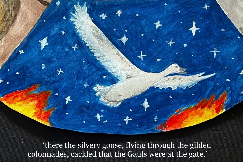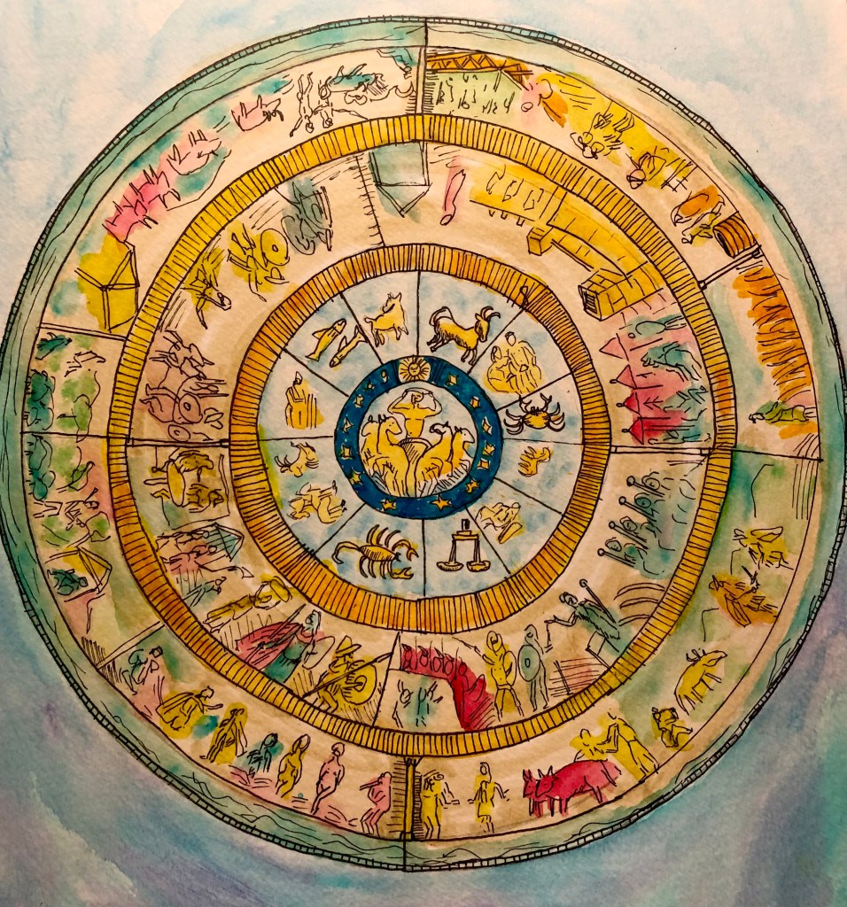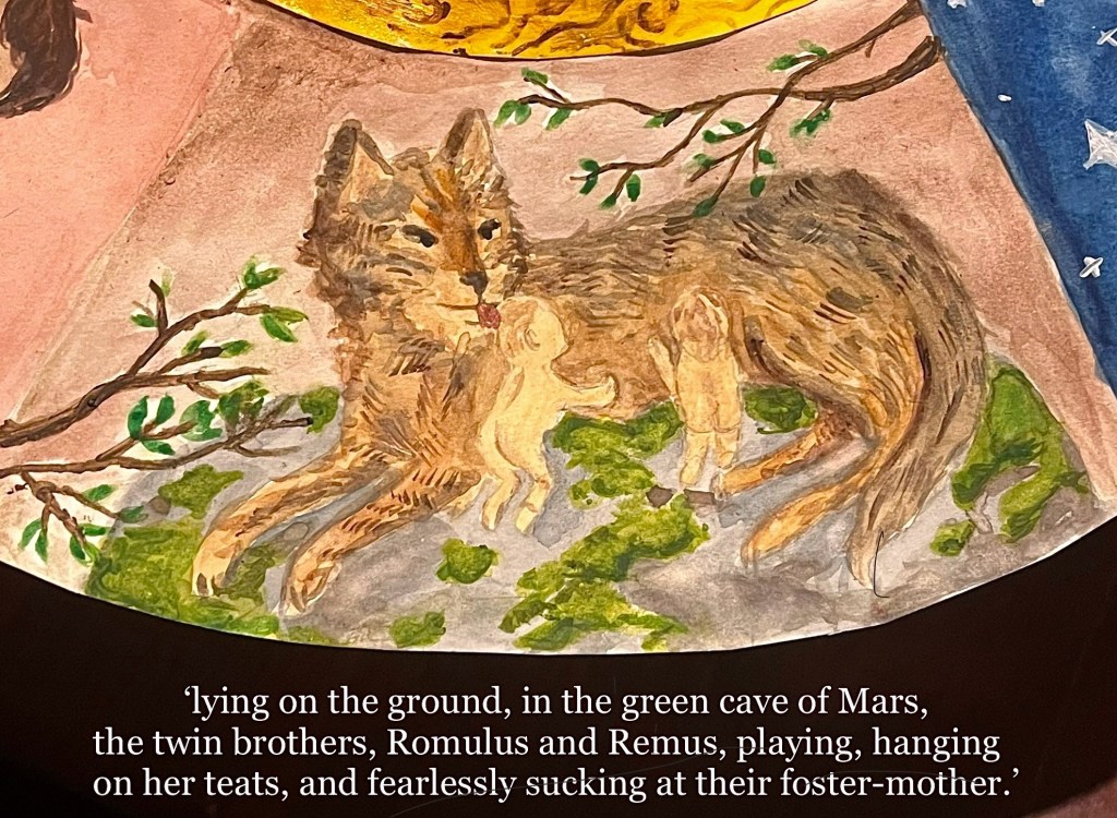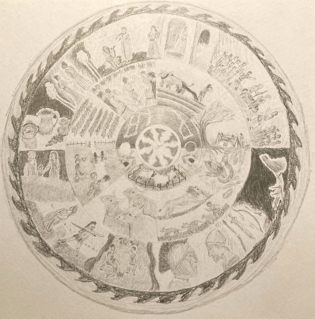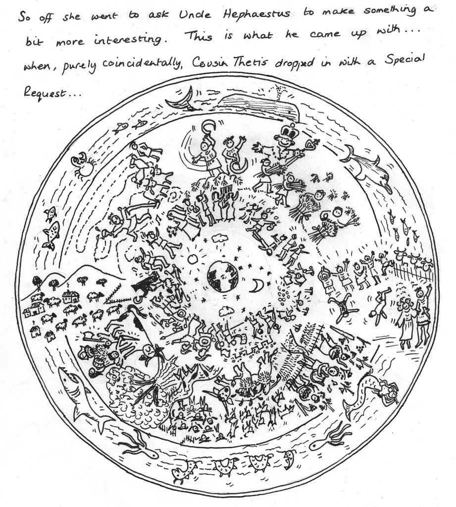 This is quite the challenge, so we were delighted by all those who made the leap over the high bar for entry. In the end we received some wonderful entries, both digitally and in physical form, with a marked preference for Achilles’ shield over Aeneas’. We also received some entries that were splendid pieces of art, but not obviously shields; and we also received some entries that were manifestly not wrought by human hands at all. Many thanks to all who took the time and effort to enter: it gives us great joy that you leapt into the undertaking, especially if you enjoyed making the art anywhere near as much as we did looking at it.