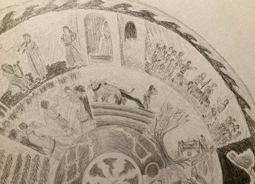 Our latest contest was in the artistic realm: we challenged readers to draw or paint either Homer’s Shield of Achilles, or Virgil’s Shield of Aeneas, using the text of these epic poems to create, from mere verbal ecphrasis, real art in the real world.