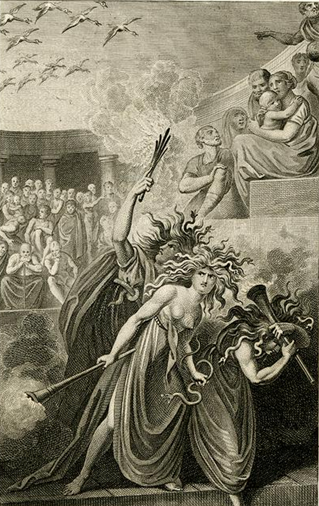 One unique example is Friedrich Schiller’s “Cranes of Ibycus”. The poem was composed during the height of what’s known today as Germany’s Weimar Classical period (roughly 1772–1805), during which the poets Goethe and Schiller flourished, reviving interest in the Classical Greek tradition at the height of Germany’s cultural maturation. Schiller’s poem revisits the legend surrounding the life of the Ancient Greek poet Ibycus. Schiller used the myth as poetic material to revisit thematically the Ancient Greek notion of divine justice, as embodied by Nemesis and the chthonic goddesses of retribution, the Erinyes (or Furies).