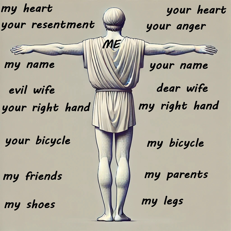 According to 1R, the NA phrase can appear in situations where, as a Homeric observer, you refer to someone or something on which your existence and identity directly depend, or which exists and functions as a result of your existence. Such beings and things include, for example: your body parts, your soul, your parents, your children, your wife/husband (because in the act of sexual union, they become part of your body), your leader or king (because their existence defines your identity as a subject), your herald (because they carry your voice, whose existence depends on your body), your home and homeland when you are at home (as they define your identity as someone born, living, and originating from somewhere), various objects, such as your sword (as it defines your identity as a warrior), your bow (if you are an archer), your scepter (if you are a priest or leader), or your ship (as it requires your body to function as a means of transport). Since the NA phrase records your attention directed toward the heart of another person in the default perceptual arrangement, and the heart is the emotional center of a Homeric character, this means that on your right side, you observe the healthy emotions of others.