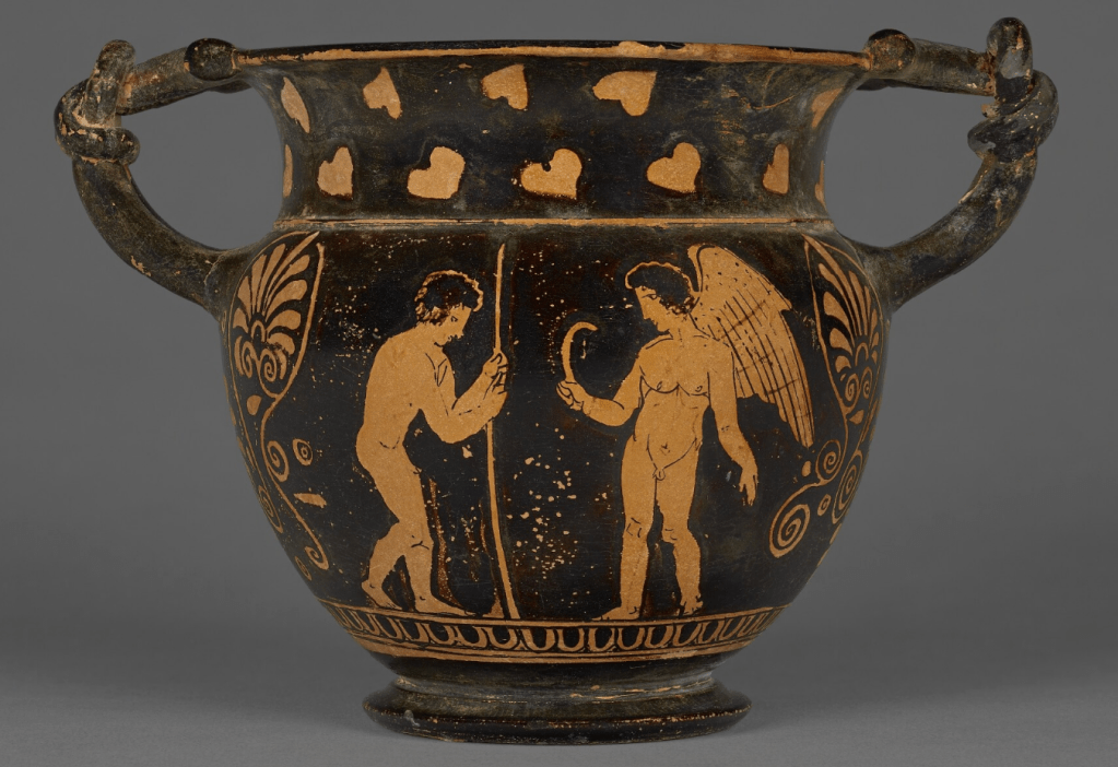 Hecuba, heartsick, came to them. She held in her right hand a golden cup of wine as sweet as honey, so that they could pour libations for the journey.