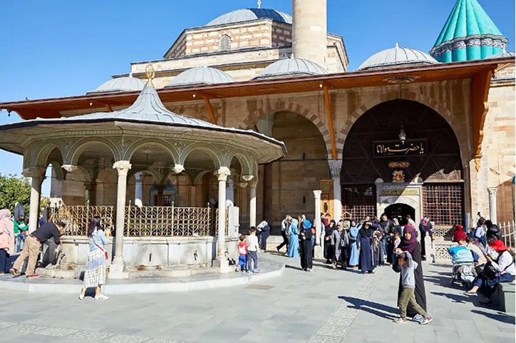 The Mevlรขna Museum, formerly the lodge of the Whirling Dervishes, represents the architectural traditions of medieval Seljuk Turkey. The complex developed around the tomb of Jalal al-Din Rumi (1207โ73), known to his followers as Mevlรขna. The distinctive green dome, rising 25 metres above the mausoleum, was added in the 16th century. Below it lies the tomb of Rumi, covered with a remarkable sarcophagus decorated with verses from his works inlaid in gold.