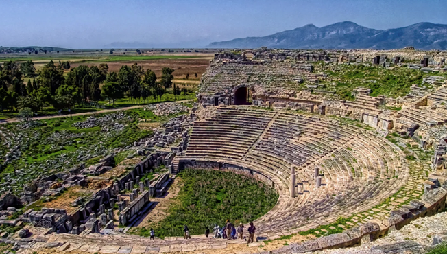 The theatre of Hierapolis stands among the most perfect I have yet encountered in Asia Minor. Most remarkable is the stage building, which rises to its full ancient height, adorned with a profusion of columns, niches, and relief carvings of exceeding delicacy. The figures of Apollo and Artemis, though somewhat weathered, retain their divine dignity, whilst the Emperor Marcus Aurelius may still be discerned amongst the company of gods depicted upon the frieze.