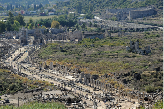 It had other famous visitors in Antiquity apart from Alexander. Verres, the arch-villain of Ciceroโs speeches against him, heard that Artemisโ temple at Perge was rich and sent his thugs to plunder it. There are pleasanter reasons to remember Perge. Apollonius of Perge (c.262โc.190 BC), to be ranked alongside Euclid and Archimedes as one of the greatest mathematicians of the ancient world, perhaps scratched his diagrams in the dust of the cityโs agora and it should not be forgotten that another famous figure called in to the city on his travels. St Paul, together with Barnabas, visited the city on their way to Antioch. He had undoubtedly heard of the cult of Artemis Pergaia. Possibly he viewed his visit as a rehearsal for the later riot of silver smiths that he provoked at Ephesus: โGreat is Artemis of the Ephesians!โ He did not stay long at Perge!
