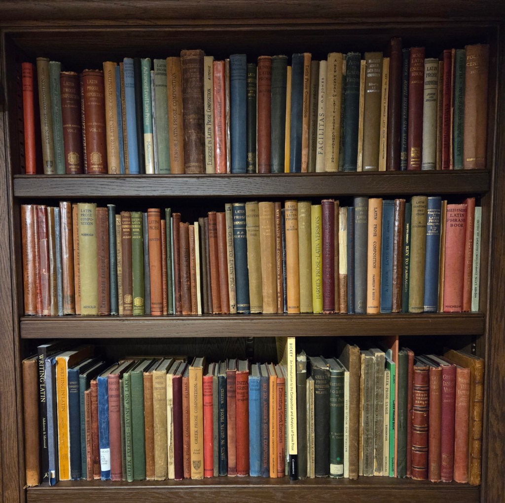 If you wish to read further on the topic, there are plenty other options. Most of the manuals about Latin prose composition can be found via the Internet Archive or (if pre-1900) Google Books. If you can pick out any titles in this image, 9 out of 10 of these books are available freely online: