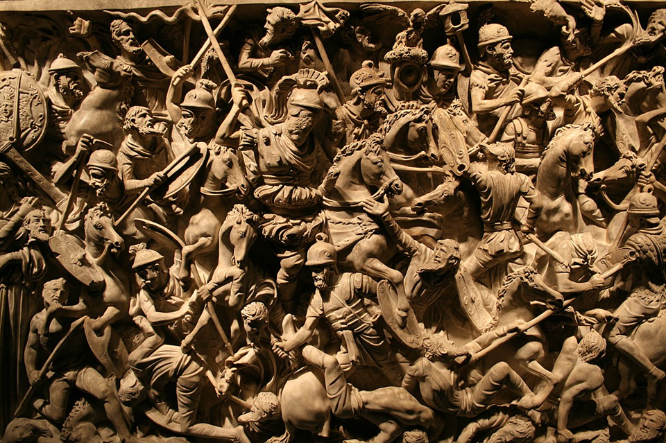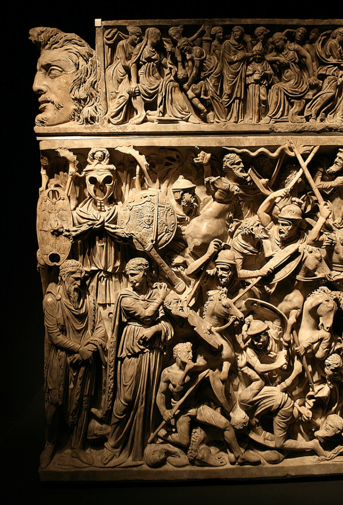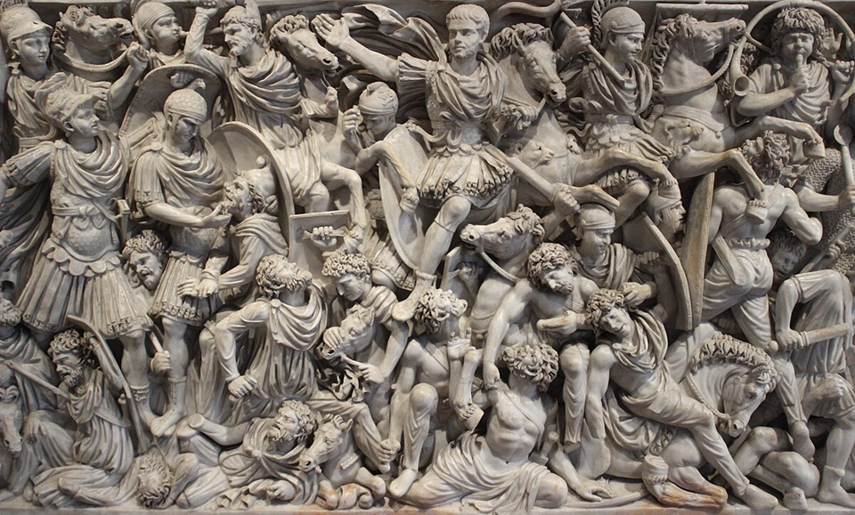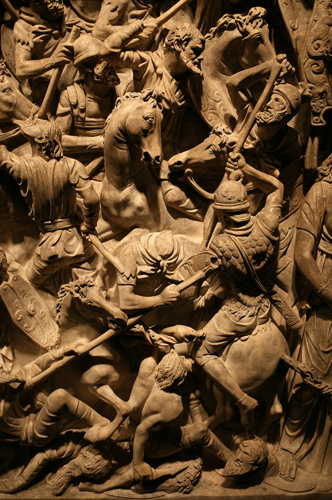 As for the body of the sarcophagus: the image is a little less confusing if you divide it into four levels, or registers, from top to bottom, with two layers of Roman cavalry at the top, a layer of infantry below them, and – at the bottom, of course – defeated, subjugated barbarians.