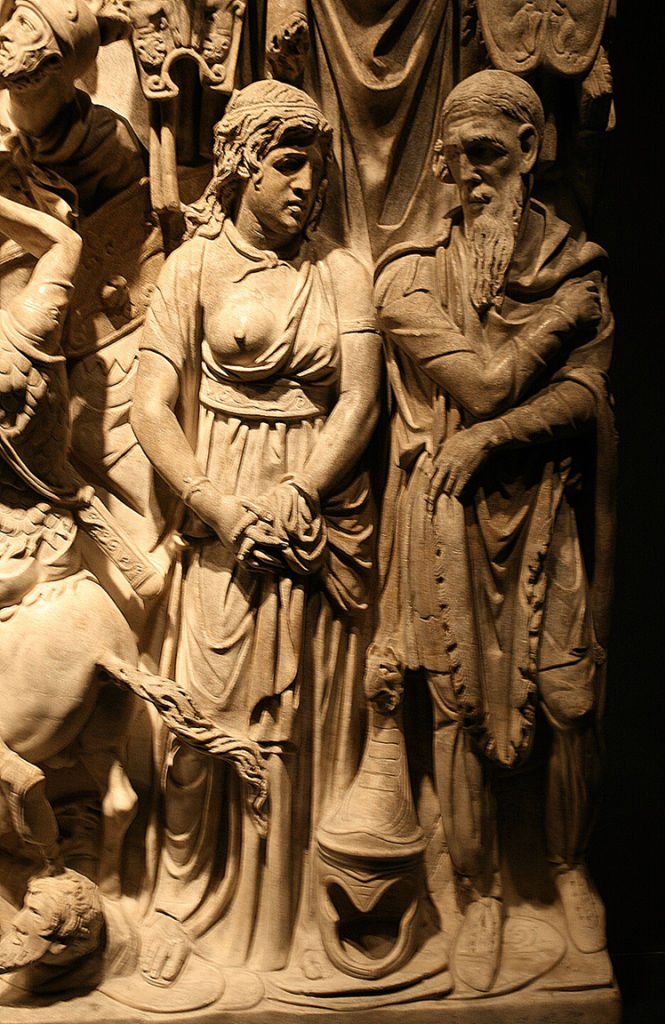At left and right there are trophies of barbarian arms and armour, and a pair of humiliated captives (female as well as male) who are recognisably non-Roman in their hair and clothing.