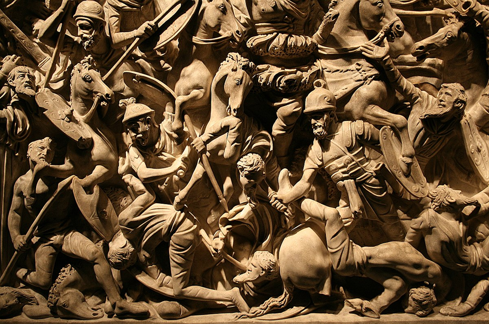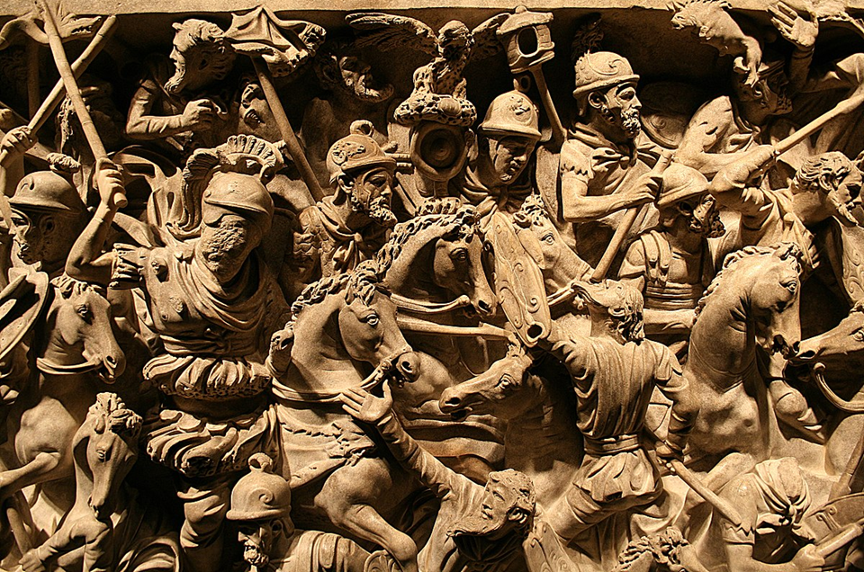 Battle sarcophagi ultimately derive their imagery from Hellenistic precedents – for example, monumental sculptures in Pergamon commemorating victories against the Gauls – but we shouldn’t presume that artisans of the 2nd century AD had direct access to such memorials. Their main influences were inevitably local. The Roman workshops where some of the very finest battle sarcophagi were created seem to have drawn inspiration from Trajan’s Column, the Column of Marcus Aurelius, and the now-vanished Arch of Marcus Aurelius.