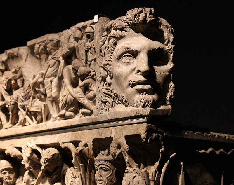 You can be forgiven for finding all the detail overwhelming. It takes some time to get a sense of what is going on here. The lid of the sarcophagus features masks of barbarians at each end.