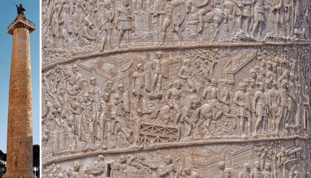 Trajan’s Column stands 115 feet high; the Column of Marcus Aurelius is even taller, at 130 feet. It seems much livelier and more sophisticated than its predecessor; the artists and artisans who worked on it appear to have had more fun with their material.