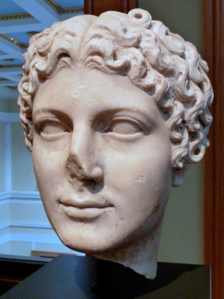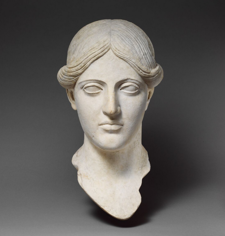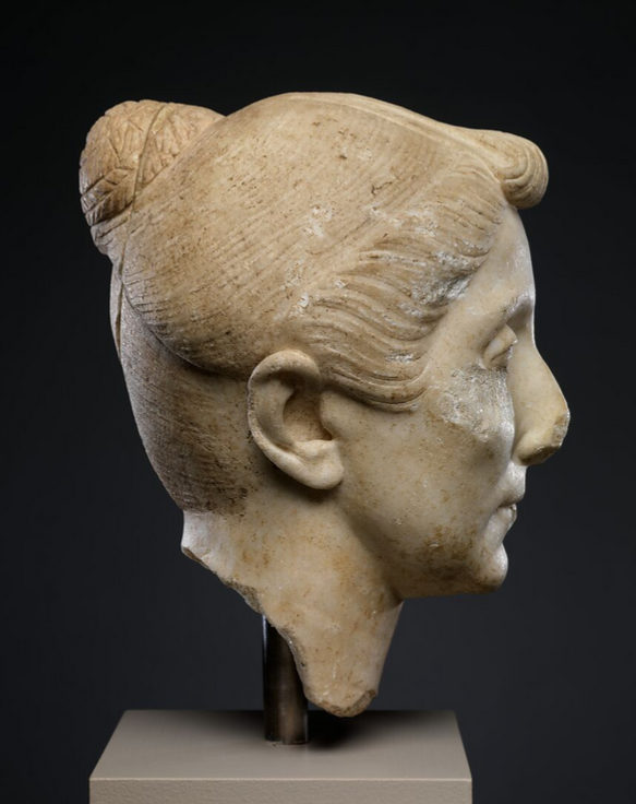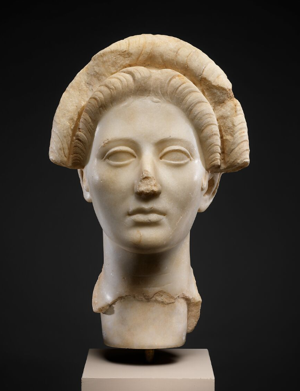 Surviving classical and Hellenistic-era sculptures of women tend not to feature elaborate hairstyles. Perhaps this is because most surviving examples are either memorials to virtuous Athenian wives and daughters on grave stelae, or else depictions of goddesses, whose immortal beauty requires no adornment. A select few depict eastern queens, who have little need of status symbols to remind people of who they are.