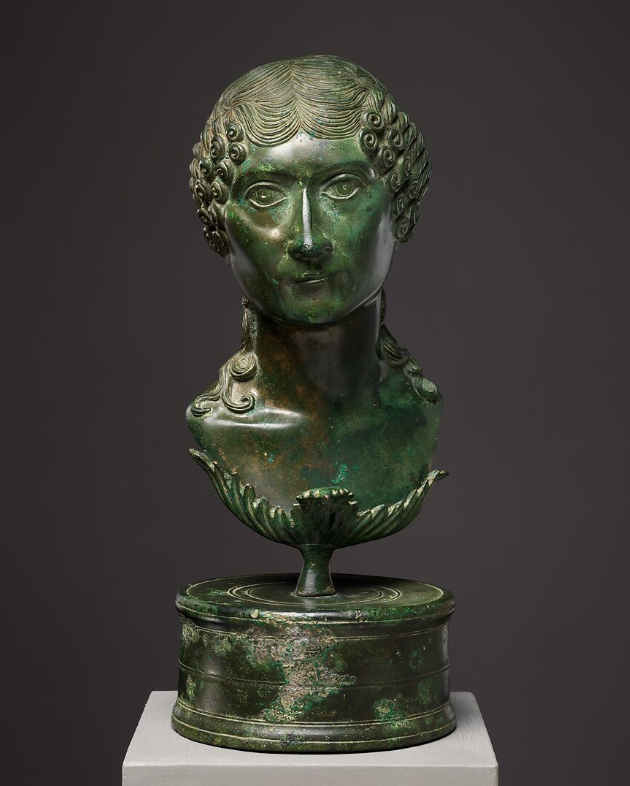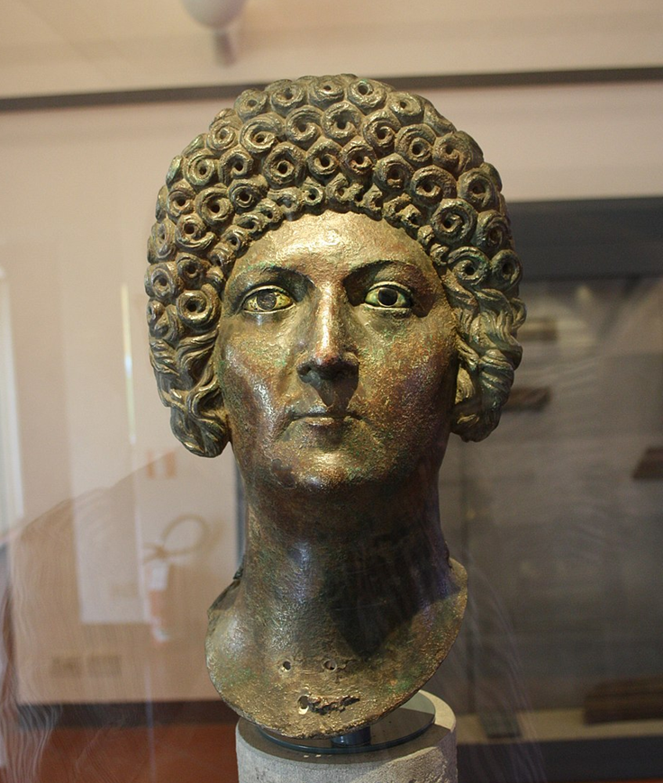 A rare gilded bronze head that was unearthed in 1826 and is now in display at the Santa Giulia Museum in Brescia appears to depict Domitia with one of her familiar hairstyles. This coiffure is daringly extravagant by Augustan standards, although some women in the Trajanic and Hadrianic eras would have elaborately braided hairdos and sponge-like crests and arrangements of ringlets in so many layers that they almost appear to have wedding cakes on their heads. Around three dozen female portrait busts survive from the 2nd century AD in which the hair was sculpted separately to be fitted atop the subjectโs head like a wig.