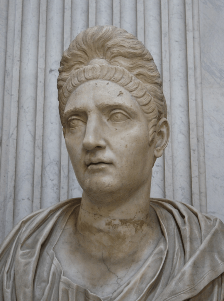 Only two female subjects of Flavian-era portrait busts have been positively identified: Julia Flavia (AD 63โ91), known as Julia Titi, and Domitia Longina (AD c.50/5โ126/30). Julia Flavia was Domitianโs niece, and perhaps also his mistress; Domitia was his wife, and seems to have been implicated in his assassination. Both women feature on imperial coins; this has enabled their likenesses to be confirmed with a reasonable degree of certainty (although some art historians seem over-confident in identifying certain busts as portraits of these women).