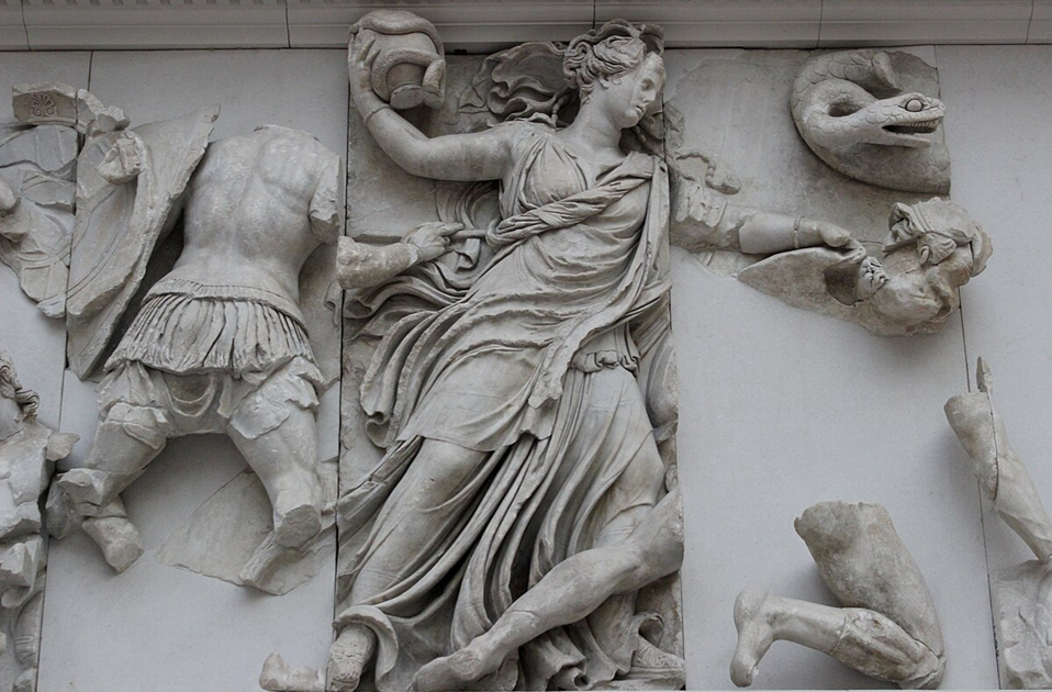 This is probably an Erinys, from the Gigantomachy frieze, to be seen in the Pergamon Museum in Berlin (after the ongoing restoration of the museum, that is). We see a female figure about to kill a male, with one great snake nearby and another coiling around the vessel she is holding. The Erinyes are horrifying. We tend to think of them as being associated with snakes, dogs, and the drinking of blood, but much of this is probably later invention; the Athenian dramatist Aeschylus played an important role in jazzing up the tradition. The image from the frieze above is even younger, from the 2nd century BC. Yet already by the time that Hesiod composed his work the Erinyes are terrifying. They are goddesses of revenge bringing about retaliation.