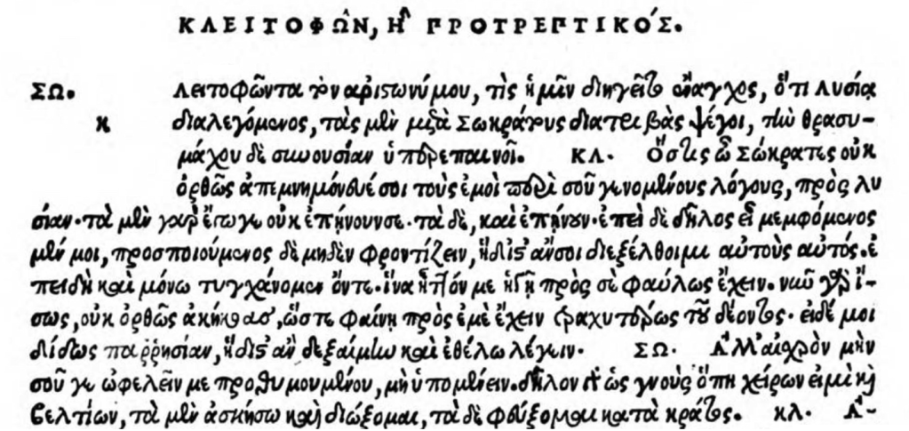 The Clitophon wastes no time getting started. Socrates immediately puts his interlocutor on the spot: heโs heard that heโs been running him down to the speechwriter Lysias while praising Thrasymachus, a theoretician of technocracy. Clitophon responds with a performance both personal and abstract, combining wounded indignation with something like an argument in a textbook on logic. Socrates, it seems, lifted him up and then let him down hard. He spoke โmost noblyโ when, โlike a god on the tragic stage [แผฯแฝถ ฮผฮทฯฮฑฮฝแฟฯ, epi mฤchanฤs],โ he exhorted the Athenians to pursue virtue, and justice above all. But neither he nor his philosophical companions can explain what justice is without arguing in circles and contradicting themselves. Maybe Socrates doesnโt know, or maybe he is unwilling to share his knowledge โ in which case, Clitophon darkly implies, he would be guilty of injustice to him, and to the city he serves. Socrates remains silent in the face of this criticism, and the dialogue ends.