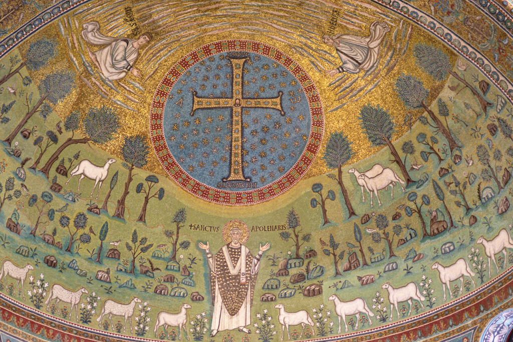 It is also worth noting that the crosses were associated with the stars and with the heavens in general, which, as we have seen, is a prominent element also in Tolkien’s mythology, where the light of the Two Trees becomes the light of the stars, used by Elbereth, or where their death gives birth to the Sun and the Moon (considered in antiquity and the Middle Ages also to be stars). Raw again: “The cross in the mosaic at Sant’Apollinare is framed in a medallion covered in stars, a feature which relates it to a number of fourth- and fifth-century mosaics in which one of the symbols of Christ – the lamb, the χρ or the cross – is displayed against a background of stars.”[16]